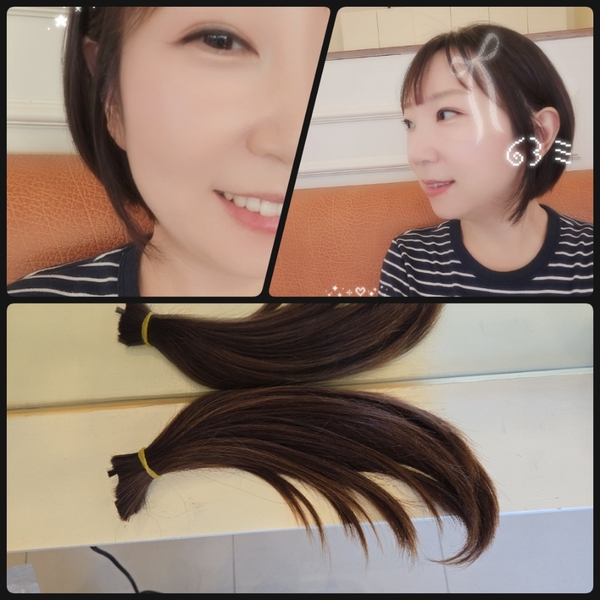 | ▲ 머리카락 기부를 위해 2~3년간 길러온 머리를 잘라 단발로 바꾼 모습(위). 잘라낸 머리카락은 소아암 환아들의 가발 제작에 사용될 예정이다(아래). | ||