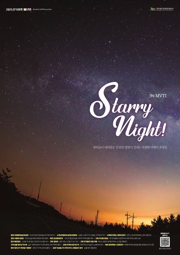 경북문화관광공사(이하 공사)는 9월 ‘경북여행 MVTI’의 테마로 가을밤의 낭만과 신비를 담은 ‘Starry Night!’를 선정하고, 천문·자연·역사 관광지를 중심으로 야간 관광지 홍보에 나섰다.