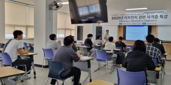 지난 6월 30일부터 7월 24일까지 열린 이번 특강은 신소재배터리계열 전임교수들이 강사로 참여해 산업안전산업기사, 위험물산업기사, 화학분석기능사 과목을 집중 교육했다.