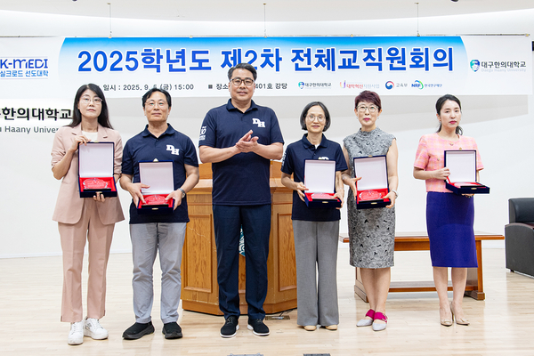 | ▲ 대구한의대 2025학년도 2차 전체 교직원회의에서 수업평가 우수교원 시상 후 변창훈 총장과 기념촬영을 하고 있다. 대구한의대 제공 | ||