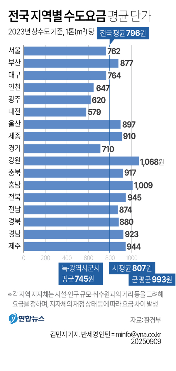 환경부에 따르면 2024년 기준 전국 평균 상수도 요금은 톤(㎥)당 약 880원이지만, 가장 낮은 지자체는 400원대, 가장 높은 곳은 1700원을 넘기도 한다.