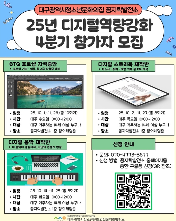 꼼지락발전소는 올해 1~3분기에도 ITQ 자격증, 숏폼 영상편집, 챗GPT 문서작성, 디지털 일러스트, 웹소설 체험, 이모티콘 제작 등 다양한 프로그램을 운영했다. 이 과정을 통해 청소년과 시민의 디지털 문해력 향상에 기여한 바 있으며, 4분기 과정도 현장 중심의 교육과 실습을 강화해 성과를 이어간다는 계획이다.