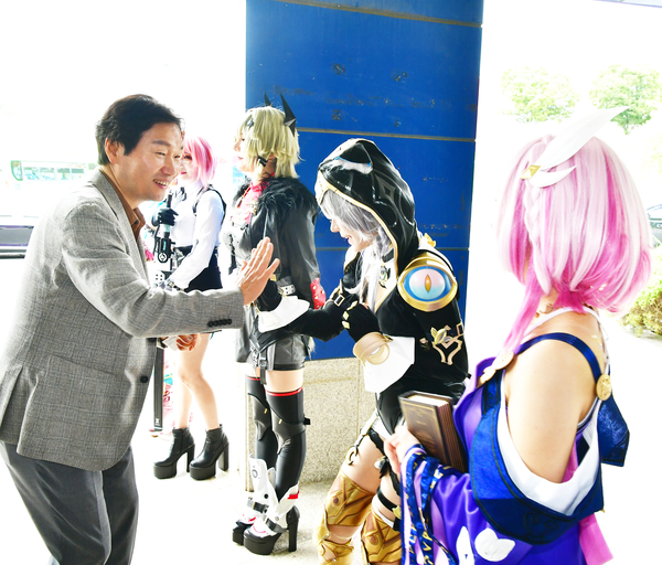 | ▲ 12~13일 경일대에서 열린 ‘2025 경북 게임 페스티벌’에서 조현일 경산시장이 인사를 나누고 있다. 경산시 제공 | ||