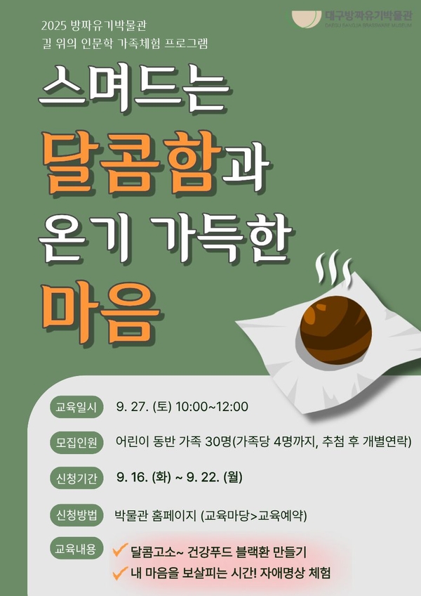 대구방짜유기박물관을 비롯한 대구 시립 3개 박물관 관장을 맡고 있는 대구문화예술진흥원 신형석 박물관운영본부장은 “9월 가족 체험 프로그램에 참여하여 가을 정취를 느끼며 즐거운 시간을 가지시길 바라며 아울러 박물관 상설 전시와 특별기획전, 작은전시 등을 관람하며 전통문화와 대구 지역사에 대해 이해하는 시간을 가져보시면 아주 유익할 것”이라고 권했다.