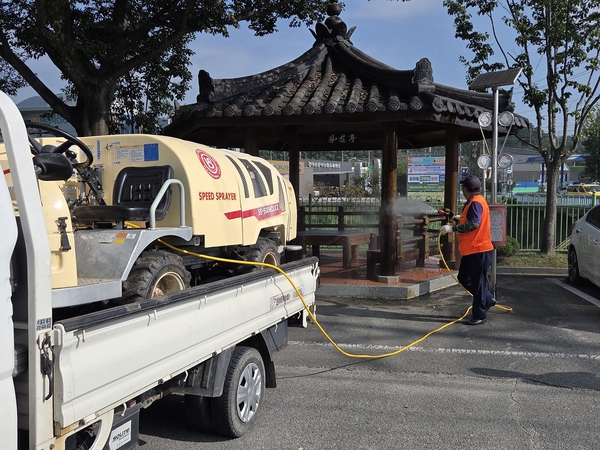 | ▲ 봉사단원이 마을 정자 방역 및 청소를 하고 있다. | ||