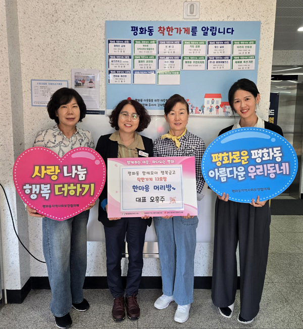 한마음 머리방은 2011년부터 착한가격업소로 지정돼 어르신과 장애인, 아동에게 커트를 1만원에 제공하며 오랜 시간 따뜻한 마음을 나눠왔다. 또한, 오홍주 대표는 10년 넘게 취약계층을 위한 이·미용 봉사활동을 꾸준히 실천해 왔으며, 평화동지역사회보장협의체 위원으로도 활동하며 지난 2024년부터 행복금고 정기기부를 이어왔다. 더 나아가 평화동 착한가게 13호점으로 동참하면서, 지역사회에 훈훈한 울림을 전하고 있다.