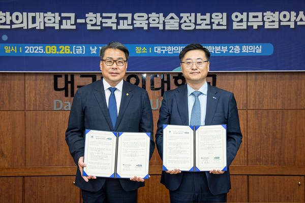 이번 협약식에는 대구한의대 변창훈 총장, 정성화 경영부총장, 장정현 노마드교육혁신처장을 비롯한 대학 관계자와 KERIS 정제영 원장, 정광훈 학술데이터본부장, 이종현 데이터분석부장이 참석했다.