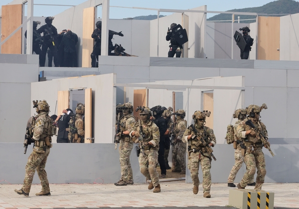 | ▲ 26일 경주 한국원자력연구원 양성자과학연구단에서 열린 2025년 국가 대테러종합훈련에서 인질 테러 대응 훈련이 진행되고 있다. | ||