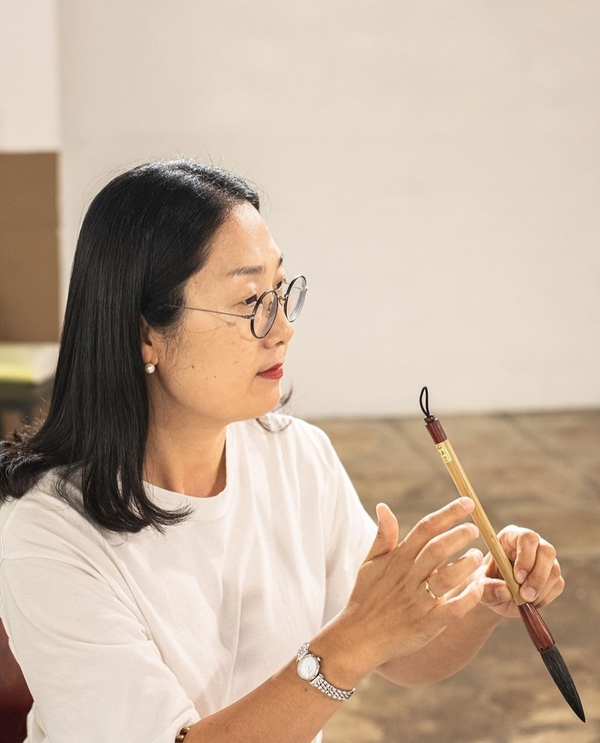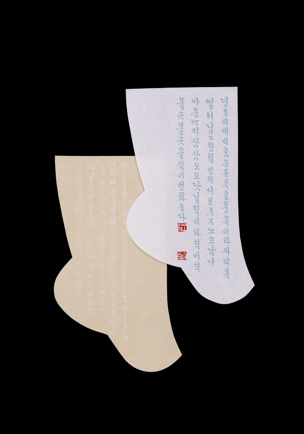 오현아 작가는 전통적으로 흰 종이에 먹으로만 표현해온 서예의 틀을 넘어, 연두·분홍·주황 등 파스텔 톤 담채와 물감을 활용해 따스하고 정겨운 서예를 선보인다. 또 버선본, 조선 백자의 형태로 오려낸 종이나 비단천 ‘옥사(玉紗)’ 등을 사용해 색다른 시각성과 질감을 더했다.