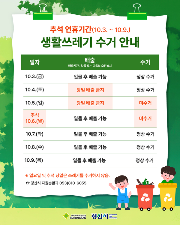 시 관계자는 “추석 연휴가 7일간 지속됨에 따라 쾌적하고 깨끗한 명절 분위기 조성을 위해 무단투기를 자재하고 각 가정에서도 쓰레기 배출량 최소화하고 배출 일자 및 시간을 준수하여 배출해 주길 바란다”고 말했다.