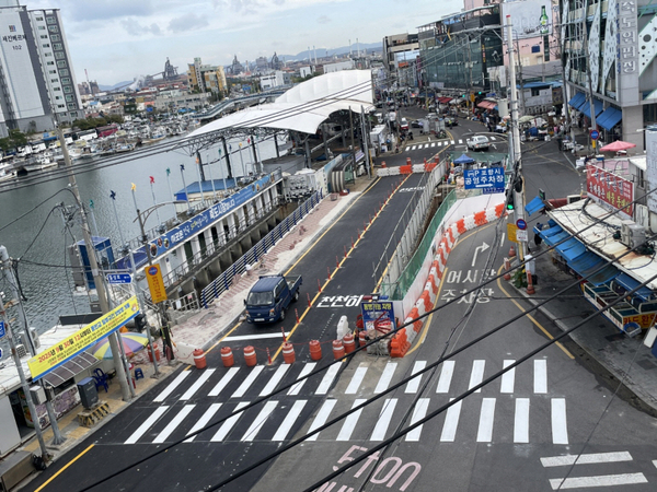 임시 개통 구간은 죽도 위판장 앞 도로다. 기존 일방향 통행을 양방향으로 전환해 공사 구간 절반을 임시 개방하는 방식이다.
