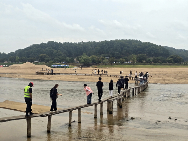 전시와 포토존도 눈길을 끈다. 천연염색 패브릭 전시, 무섬 수채화 전시, 샌드아트·달 조형물 포토존 등이 운영되며, 외나무다리에는 야간 조명이 설치돼 낮과는 다른 낭만적인 풍경을 연출한다.