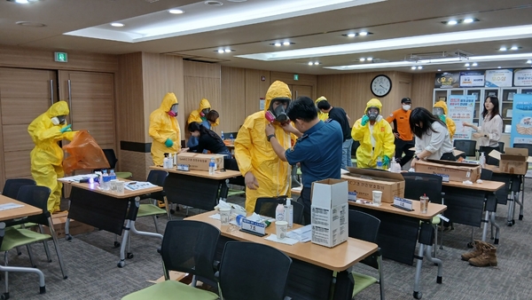 또한, 실습 과정에서는 소방서 119재난대응과의 지도 아래 개인보호구 Level A(완전 밀폐형 보호복) 및 Level C(전신보호복) 착·탈의 훈련이 진행됐다.