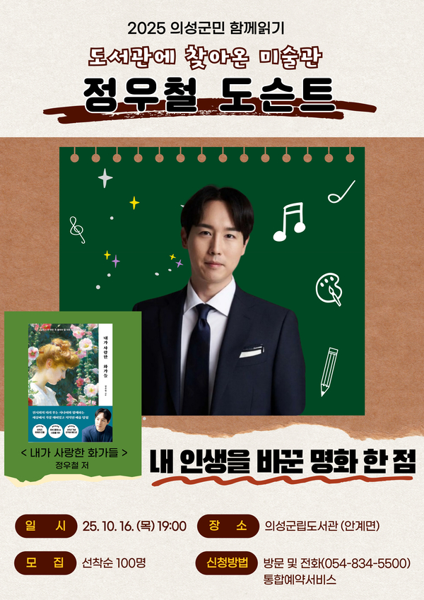 김주수 의성군수는 “정우철 도슨트의 명화 이야기를 통해 군민들이 예술을 보다 친근하게 느끼고, 일상 속에서 위로와 영감을 얻는 시간이 되길 바란다”며 “앞으로도 다양한 문화예술 강연을 통해 군민의 문화 향유 기회를 확대해 나가겠다”고 말했다.