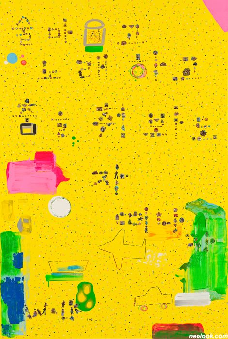 | ▲ 2012년 이명미 작품 '떠나자' 캔버스에 아크릴채색, 스티커, 혼합재료 194×130cm | ||