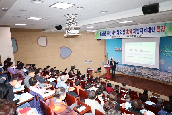 이날 특강에서 김 의장은 ‘신뢰받는 의정, 힘이 되는 의회’를 주제로 △지방자치의 의의 △지방의회 기능과 역할 △포항시의회 현황과 운영 방향 등에 대해 설명과 함께, △첨단산업도시 △푸른 정원도시 △해양문화관광 콘텐츠도시 등 포항의 미래 모습을 제시하며 신산업 육성을 통한 산업구조 다변화, 국제전시컨벤션센터 건립 등 MICE산업 육성, 북방물류 거점항만 구축 등 포항시의 주요사업을 소개했다.