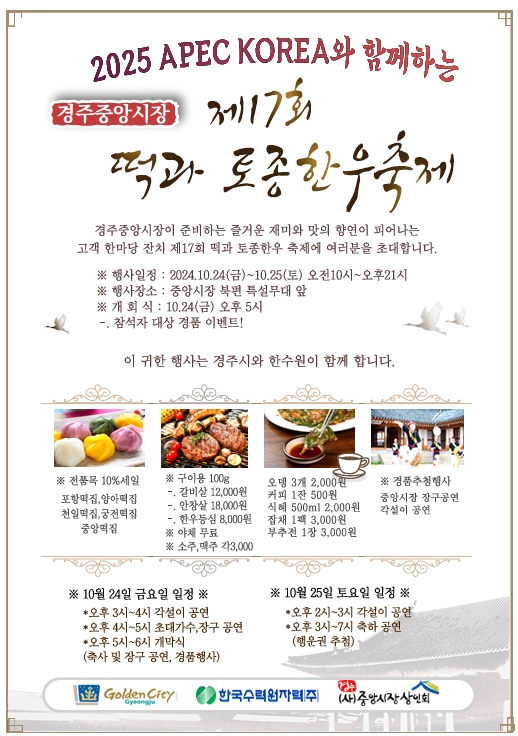 축제 기간 경주 중앙시장 북부 특설무대에서는 떡메치기 퍼포먼스, 장구 공연, 초대 가수 무대 등 다양한 공연이 펼쳐진다. 이밖에도 떡·한우 시식회, 전통차 무료 시음 코너, 상품권 경품 이벤트 등 시민과 관광객이 함께 즐길 수 있는 체험 프로그램도 마련됐다.