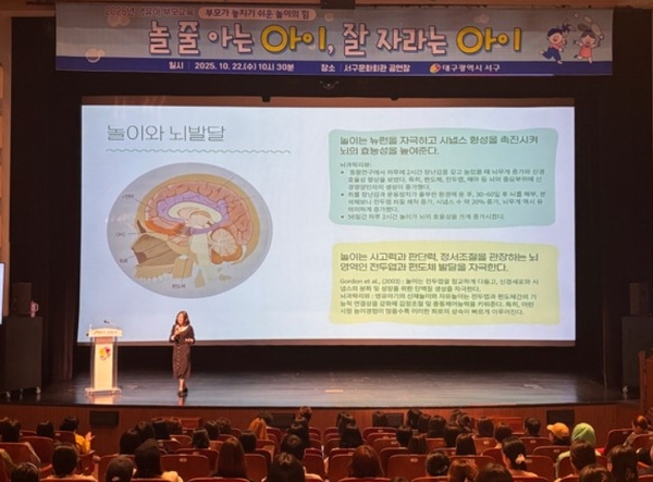 이번 강연은 육아전문가 이보연 깨알연구소 소장이 진행했다. 놀이가 단순한 여가 활동이 아닌 아이의 뇌 발달과 정서적 성장에 중요한 역할을 한다는 점을 강조했다. 특히 발달 단계별 놀이법, 놀이를 통해 아이의 진짜 마음 읽기, 부모가 함께 즐겁게 놀아주는 방법 등을 실제 사례 중심으로 풀어내 큰 호응을 얻었다.