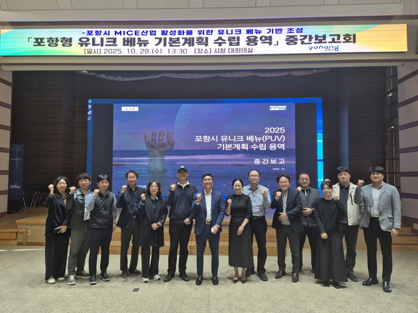 이번 중간보고에서는 △국내외 유니크베뉴 운영사례 분석 △포항 유니크베뉴 후보지 조사 △전문가 의견조사 결과 △포항형 정체성 및 운영 방향 등이 공유됐다. 특히 포항의 산업·문화·자연 자원을 결합한 MICE 행사 활용 전략과 ‘철·바다·빛’을 핵심 주제로 한 지역 특화형 유니크베뉴 육성 방향이 제시됐다.