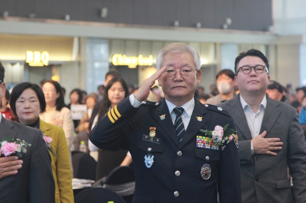 | ▲ 최미섭 대구 수성경찰서장이 치안기관을 대표해 축하 인사를 전한 후 국기에 대한 경례를 하고 있다. 김민규 기자 | ||