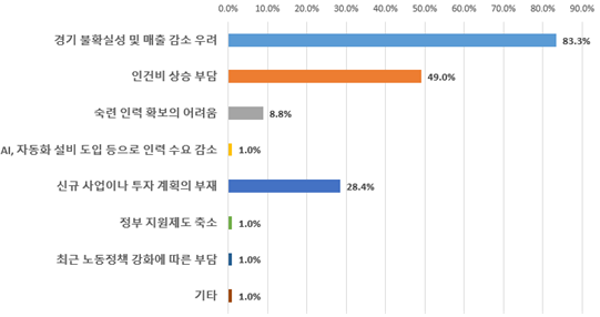 한편 ‘채용 계획이 없다’라고 응답한 기업(전체의 44.2%)들은 그 이유(복수응답, 2개까지)로 ‘경기 불확실성 및 매출 감소 우려(83.3%)’를 가장 많이 꼽았으며, 이어서 ‘인건비 상승 부담(49.0%)’, ‘신규 사업․투자 계획의 부재(28.4%), ’숙련 인력 확보의 어려움(8.8%)‘ 등의 순으로 나타났다.