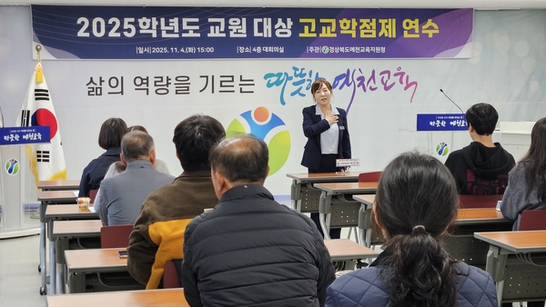 ▲ 예천교육지원청이 교원을 대상으로 고교학점제 직무연수를 실시하고 있다.예천교육지원청 제공 예천교육지원청(교육장 김현국)은 지난 4일 대회의실에서 관내 초·중학교 교원 20여 명을 대상으로 ‘2025학년도 교원 대상 고교학점제 직무연수’를 실시했다. 이번 연수는 학생 개개인의 진로와 적성에 맞춘 학업 설계 역량을 강화하기 위해 마련됐다.