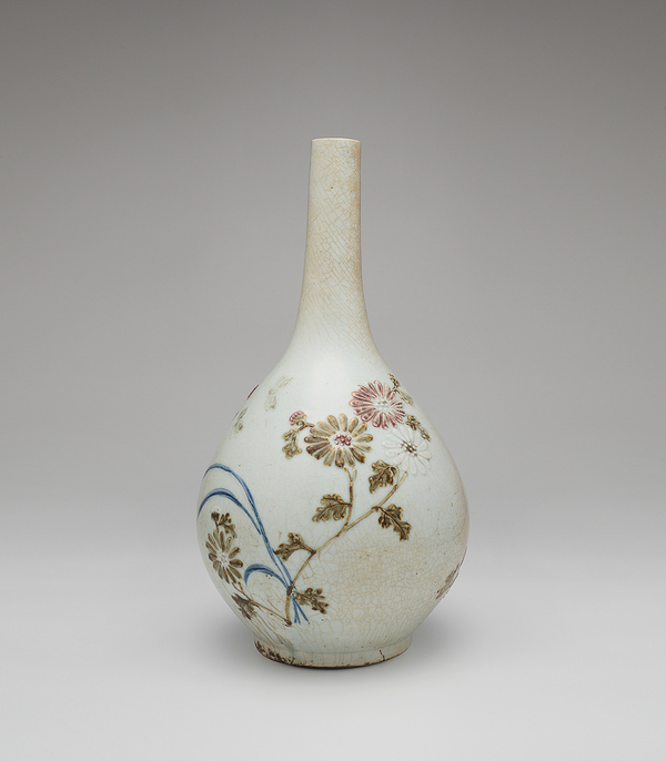 '백자청화철채동채초충난국문병'은 1936년 11월, 간송이 경성미술구락부 경매에서 일본의 세계적인 미술품상인 야마나카(山中) 상회와 치열한 경쟁 끝에 거금 약 1만4000원에 구매한 것이다. 조선시대 일반적이던 청화백자와 다르게 붉은색의 동채, 검붉은색의 철채 등 다채로운 색을 사용했으며 양각으로 조각된 국화와 난초 나비 문양에 입체감을 더해 절제된 화려함을 보인다. 또 긴 목과 달항아리 같은 원형의 몸이 크고 당당한 기형 안에 조화롭게 자리하고 있어 예술성과 기술력에서 조선 후기 문화 절정기의 절제된 화려함을 보여주는 걸작이다.