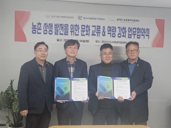 이날 협약식에는 칠곡군 농촌협약지원센터장과 칠곡군 지역활력 과장,양산시 도시재생지원센터장 및 양산시 재생전략과 관계자 등이 참석했다.