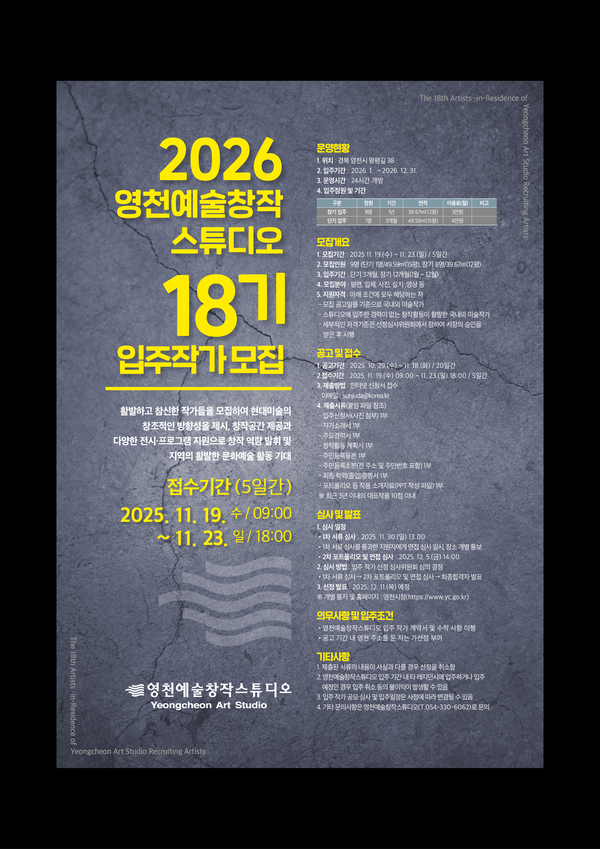 한편, 18기 입주작가 모집과 관련해 자세한 내용 및 신청 접수 방법은 영천시 홈페이지(정보공개/개방>시정소식>고시/공고)에서 확인할 수 있으며, 기타 문의는 영천예술창작스튜디오(054-330-6062)로 하면 된다.