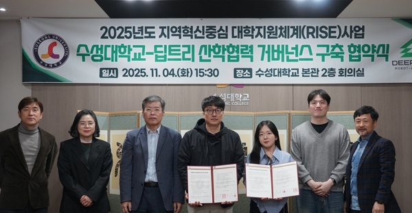 협약식에는 딥트리 이체은 대표와 수성대 김건우 부총장을 비롯한 관계자들이 참석해 지·산·학 연계 교육혁신, 취·창업 중심 평생교육 운영, 디지털 역량 강화 프로그램 개발, 지역사회 혁신 및 정주여건 개선 등을 위한 상호 협력 방안을 논의했다.