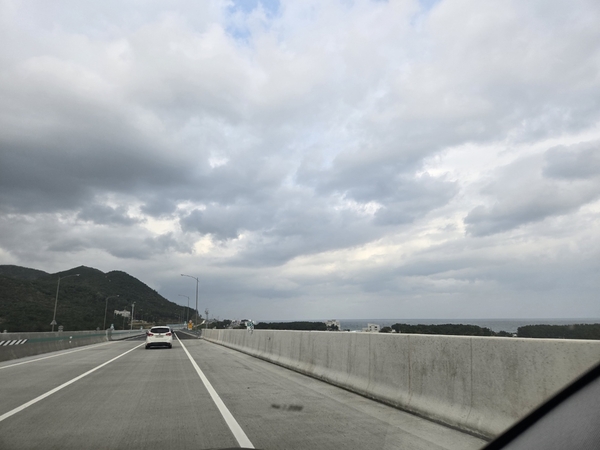 | ▲ 쫙 뻗은 고속도로 옆으로 동해바다가 보이고 있다. | ||