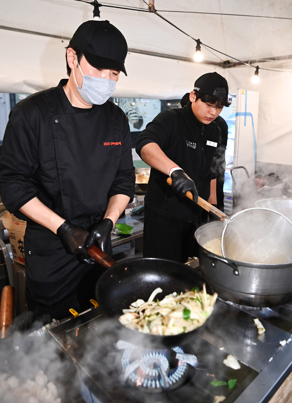 | ▲ 구미라면축제에서 셰프들이 갓 튀긴 라면으로 만든 창의적 요리를 만들고 있다. 구미시 제공 | ||