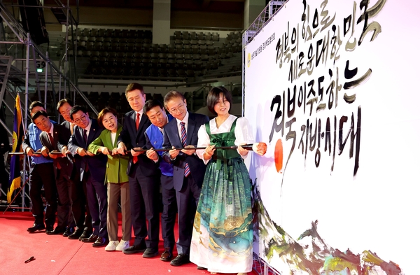 지난 7일 포항시 실내체육관에서 바르게살기경상북도협의 주관으로 열린 ‘2025 바르게살기운동 경상북도 회원대회’에서 이철우 경북도지사, 이강덕 포항시장, 김정재·이상휘 국회의원, 김대우 바르게살기운동 중앙부회장, 김재원 바르게살기경상북도협의회장 등이 퍼포먼스를 펼치고 있다. 경북도 제공