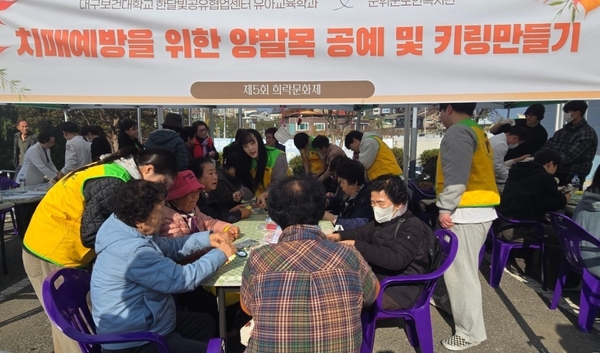 대구보건대학교 한달빛공유협업센터는 부계면 복합교류센터(6월), 삼국유사면민운동장(9월), 노인의 날 행사(10월), 희락문화제(11월) 등 군위군 주요 지역을 찾아 이동복지관을 운영했다. 간호학과, 물리치료학과, 치위생학과, 안경광학과, 뷰티코디네이션학과, 치기공학과, 유아교육학과 등 7개 학과 교수진과 재학생이 참여해 맞춤형 건강상담과 진료, 뷰티케어 서비스를 제공했다.