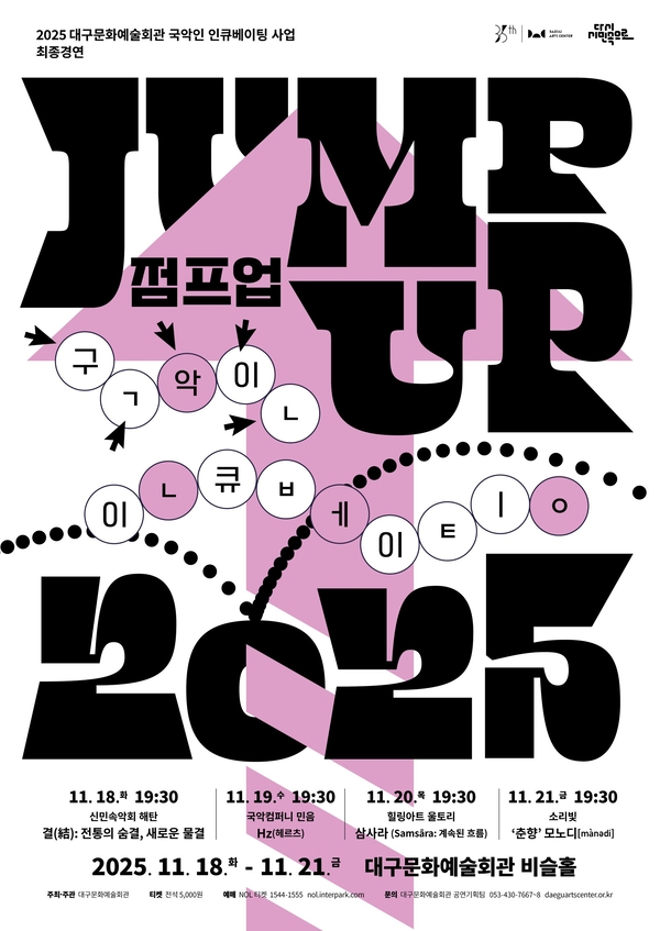 ‘젊은 국악, 대구에서 점프-업 하자!’를 슬로건으로 내건 'JUMP UP'은 전통예술의 계승과 창의적 발전을 동시에 모색하며 젊은 국악인들이 도약할 수 있는 발판을 마련하기 위해 대구문화예술회관에서 기획한 프로젝트다. 단순한 재정 지원에 머물지 않고 공연 창작 및 프로덕션 제작 지원, 전문가 1대1 멘토링, 실연 기회 등을 통해 참여 단체들이 자신만의 음악적 색을 발전시킬 수 있도록 체계적으로 지원한다.