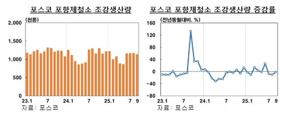 제조업의 경우 포스코 포항제철소의 조강 생산량이 전년 같은 달보다 1.8% 줄었지만, 포항철강산단 생산액은 1.3% 증가하며 업종별로 엇갈린 흐름을 보였다.