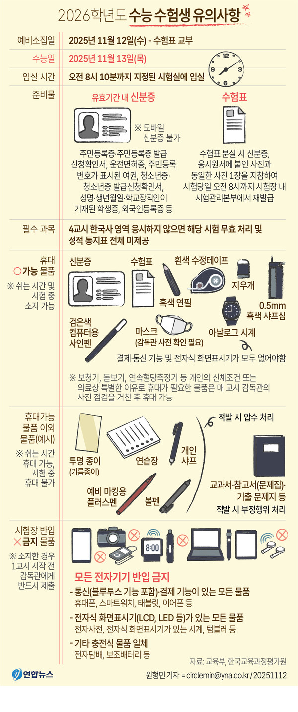 교육 당국은 “수험생들은 예비소집을 통해 유의사항을 반드시 확인하고, 당일 교통상황과 날씨에 대비해 여유 있게 이동해야 한다”고 강조했다.