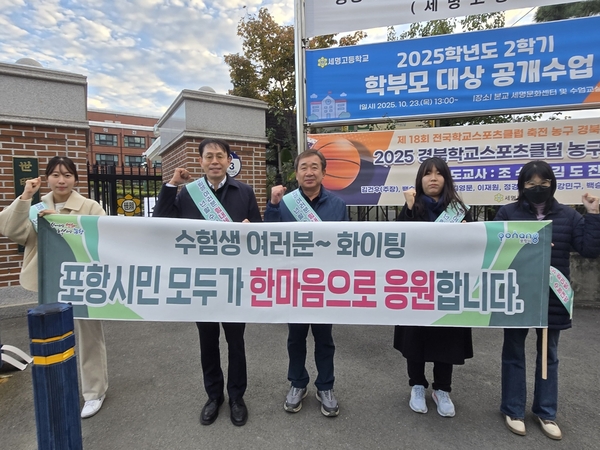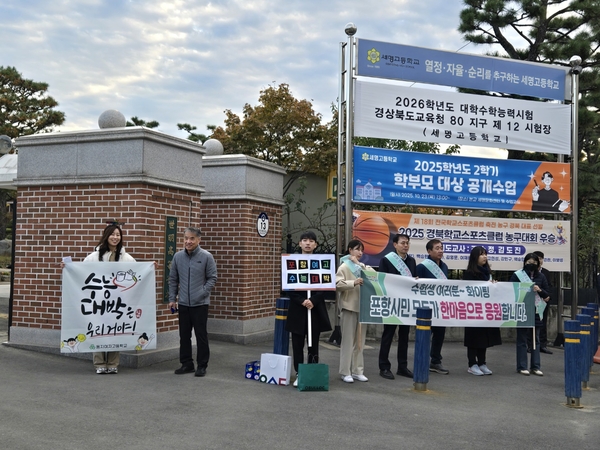 학생들은 교복 대신 후드티와 트레이닝복 차림으로 긴장된 표정 속에서도 미소를 지었고, 교사와 시 관계자들은 “포항시민 모두가 한마음으로 응원합니다”라는 문구가 적힌 현수막을 들고 따뜻한 인사를 건넸다.