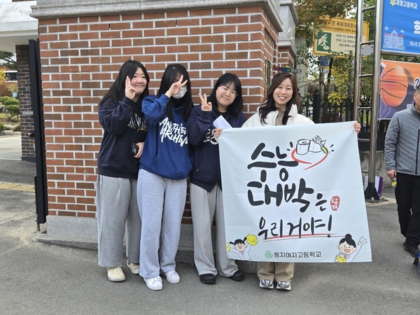 | ▲ 포항동지여자고등학교 3학년 학생들이 담임 교사와 함께 “수능 대박은 우리 거야!”라고 적힌 응원 현수막을 들고 밝게 웃고 있다. | ||