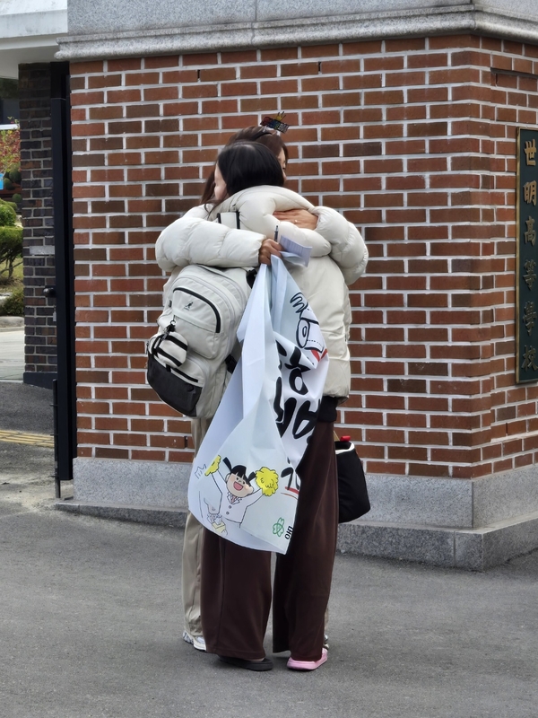 시험장으로 들어서는 동지여고 3학년 이임정(18) 학생은 “아직도 실감이 안 난다. 날이 좋은데 수능을 쳐야 해서 슬플 정도지만, 담임 선생님 기를 받아 잘 치고 오겠다”며 밝게 웃었다. 친구들과 서로를 안아주며 응원을 주고받는 모습에는 긴장과 설렘이 교차했다.