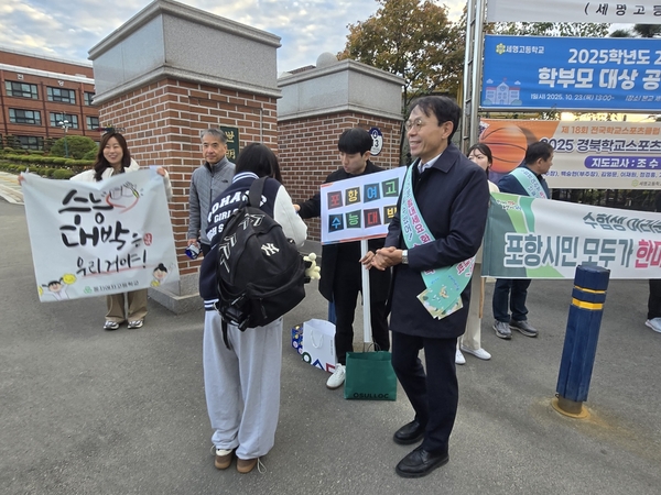 2026학년도 대학수학능력시험이 치러진 13일 오전 7시, 경북도교육청 80지구 제12시험장인 세명고등학교 앞에는 포항시와 학교 관계자, 학부모, 후배 학생들이 나와 “수능 대박”을 외치며 수험생들에게 힘을 보냈다.