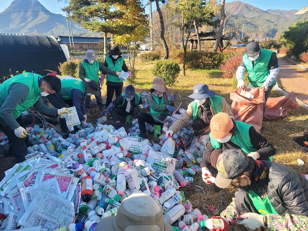 | ▲ 동로면 새마을회원들이 농약병 수거 작업을 하고 있다. 문경시 제공 | ||
