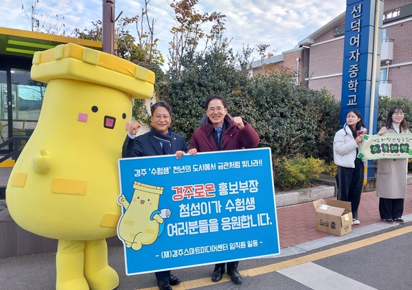 첨성이는 수능 당일 새벽부터 경주시 선덕여자고등학교 앞을 찾아, 배진석 경상북도의회 부의장을 비롯해 (재)경주스마트미디어센터 임직원 봉사자, 경주 교육지원청 관계자, 동국대학교 WISE캠퍼스 학생 봉사자, 선덕여자고등학교 관계자 등과 함께 수험생들에게 따뜻한 응원과 격려를 전했다.