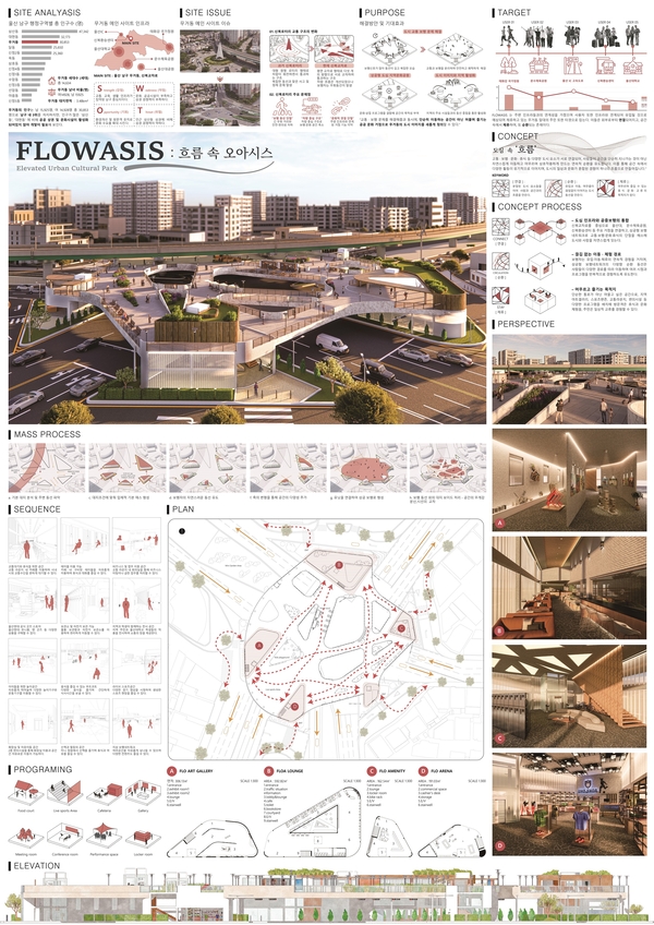 이 대회에서 이채윤 학생은 ‘흐름 속의 오아시스(Flow + Oasis)’라는 뜻의 ‘Flowasis’라는 작품으로 대상의 영예를 안았다. 이 작품은 울산 무거동 신복교차로 상공에 조성되는 공중보행형 지역문화공원을 제안한 작품이다.