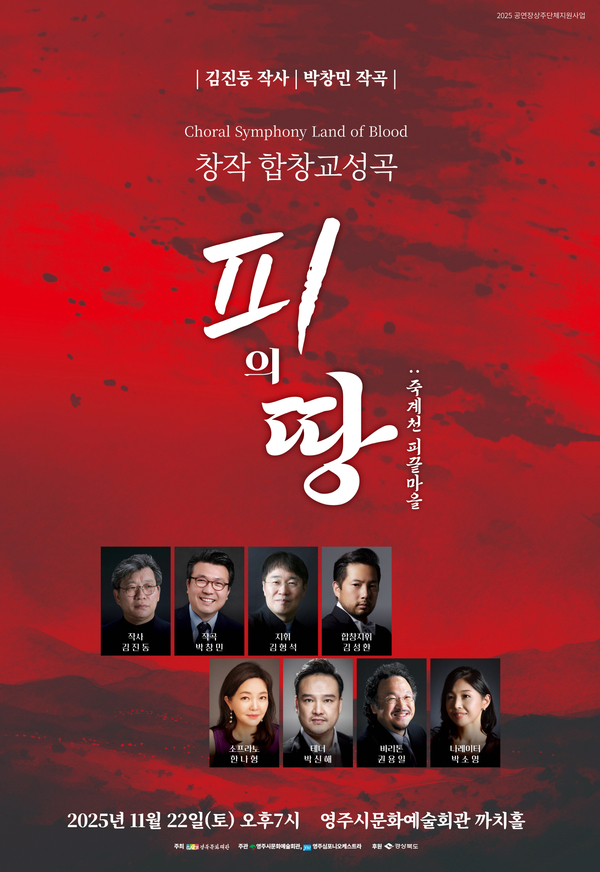 ‘피의 땅(죽계천 피끝마을)’은 조선 시대 비극 속에서 희생된 단종, 금성대군, 사육신, 순흥 선비들의 충절과 아픔을 음악으로 담아낸 창작 합창교성곡이다. 역사적 사실을 예술적으로 재해석한 이번 공연은 웅장한 교성곡과 서정적 합창이 어우러져 깊은 울림을 전달할 것으로 기대된다.