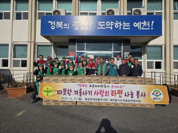 예천군 풍양면 새마을부녀회(회장 양진숙)가 지난 17일 사랑의 김장 나누기 행사를 열고 지역 어르신들을 위해 경로당 및 소외계층에 김장김치 600포기와 라면 100상자를 전달했다.또한 풍양면 민간사회안전망이 김장 준비에 힘쓴 새마을부녀회를 격려하기 위해 100만 원을 기부했다. 이경수 풍양면장은 “해마다 꾸준히 봉사를 실천해 주시는 새마을부녀회에 깊이 감사드린다”고 말했다.