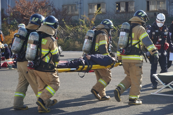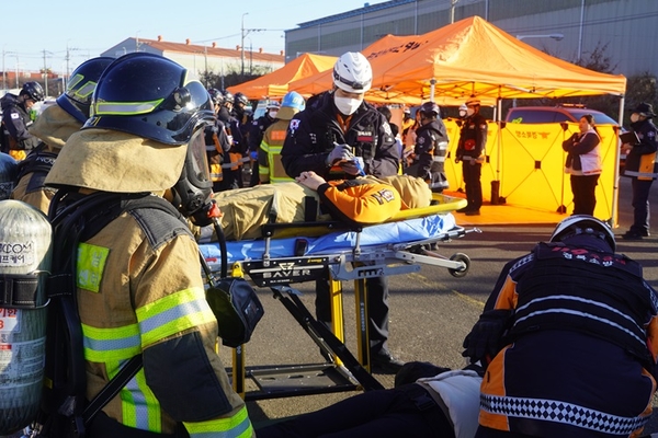 이날 한국산업 내 창고에서 대형 화재가 발생하고 건물 붕괴로 다수 사상자가 발생한 복합 재난 상황을 가정해 실제와 유사한 긴박한 분위기 속에서 진행됐다.
