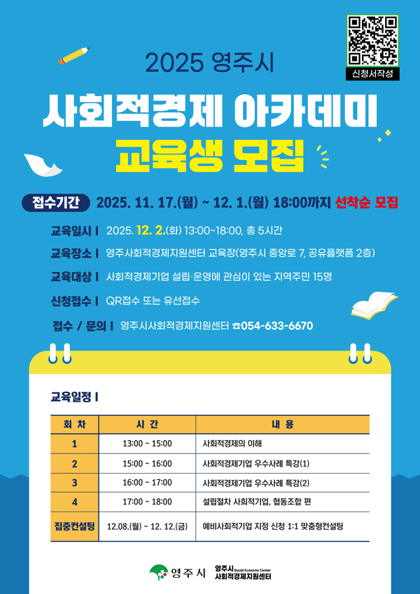 교육생 모집 관련 자세한 내용은 영주시사회적경제지원센터 홈페이지에서 확인할 수 있다. 참가 희망자는 다음달 1일까지 포스터 내 QR코드(네이버폼) 또는 유선(☏ 054-633-6670) 신청을 통해 접수할 수 있다.