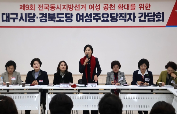 간담회에는 서명옥 중앙여성위원장과 박소영 수석부위원장을 비롯해 이재화 대구시의회 부의장, 남영숙 경북도의원 등 지역 여성지방의원, 대구·경북 여성위원장단, 차세대여성위원 등 약 100여 명이 참석해 지방정치 전반의 구조적 문제부터 여성 정치인의 현실적인 진입 장벽까지 다양한 의견을 쏟아냈다.