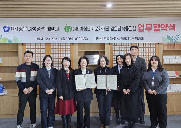 (재)경북여성정책개발원과 (재)아침편지문화재단 깊은산속옹달샘(대표 고창영)이 지난 19일 경북여성가족플라자에서 여성 리더십 강화, 심리·정서적 회복 지원, 성평등 문화 확산을 위해 양측이 업무협약을 체결했다고 밝혔다.